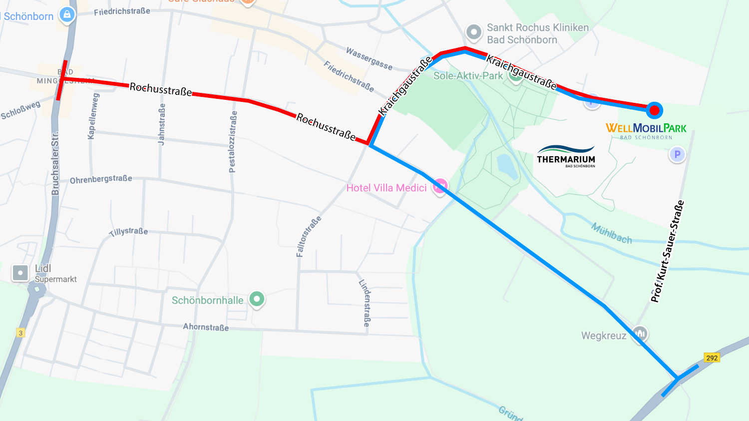 Von der B 292 (BAB 5, Kronau/Östringen) kommend: Abbiegen in die K 3522 Richtung Ortsteil Mingolsheim nach ca. 900m rechts in die Falltorstraße einbiegen, weiter fahren bis Übergang Kraichgaustraße und bis zum WellMobilPark fahren.