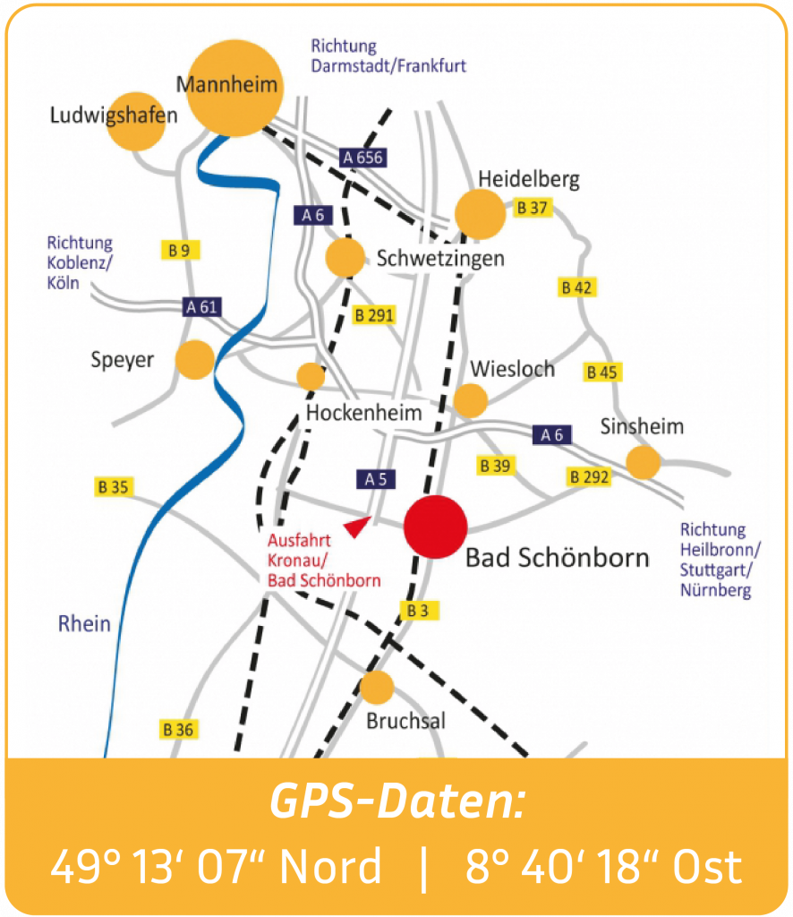 von der A5: Abfahrt 41 (Kronau) abfahren, der L555 / B292 folgen Richtung Kronau – Östringen – Sinsheim, ab Bad Schönborn den Wohnmobilsymbolen folgen